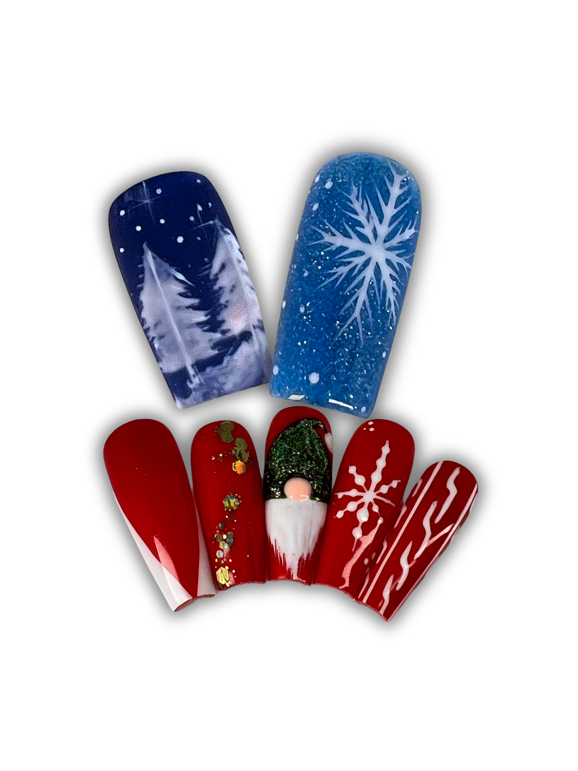 Your designs may include Solid colors, Glitters, Cat Eye, Marble, Ombre, French, Stickers, Foils, & charms.