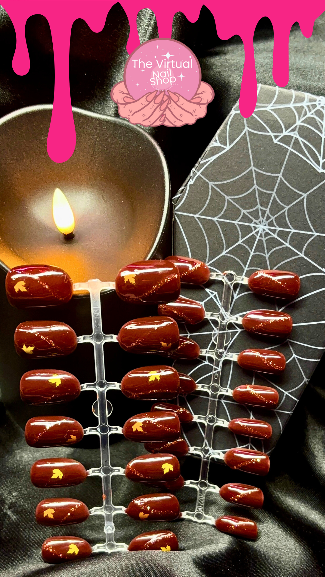 Bring cozy sweater-weather vibes to your fingertips! This rounded set shifts color with your body heat (hello, mood magic ✨), is sprinkled with striped glitter accents, and features cascading fall-leaf decals for the perfect autumn moment.